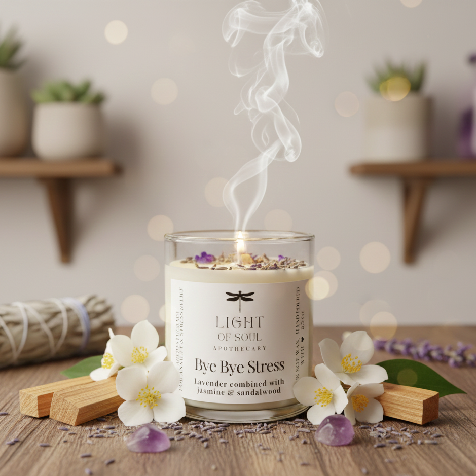 An aromatherapy-based intention candle designed to support stress relief, nervous system calm, and emotional grounding through ritual and presence.